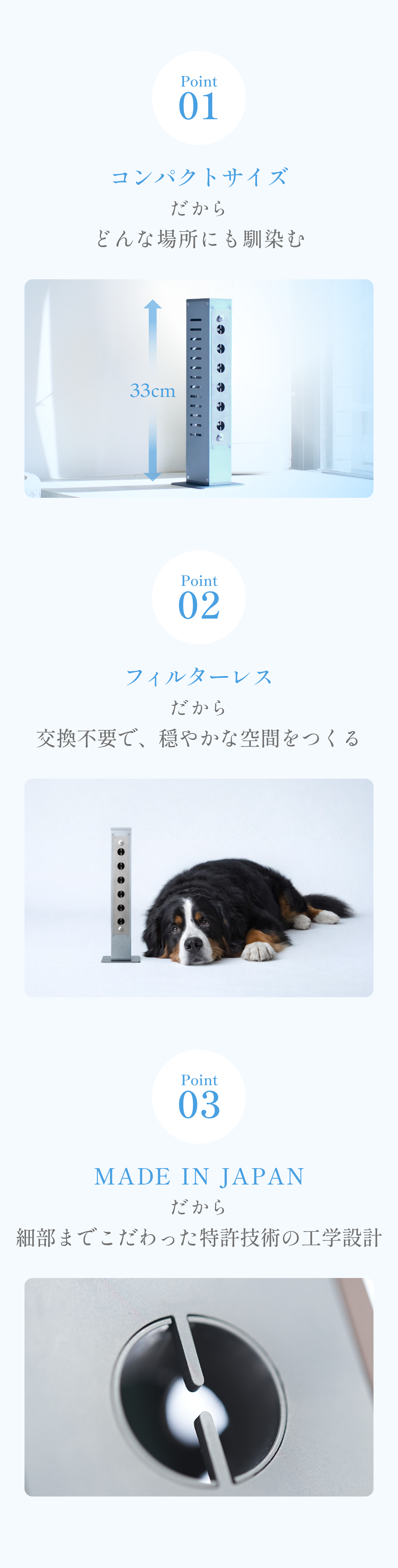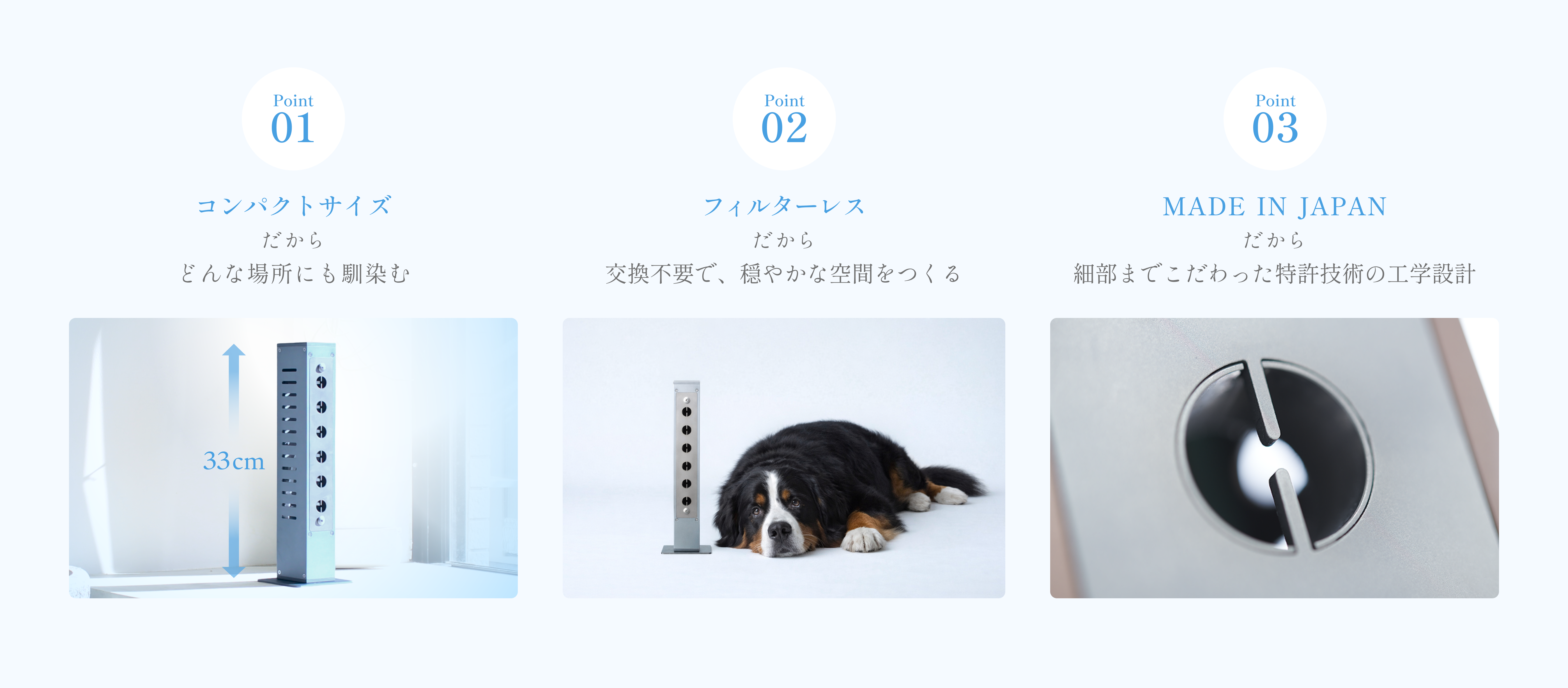 空間の静けさを変えずに、空気だけに働きかけます。