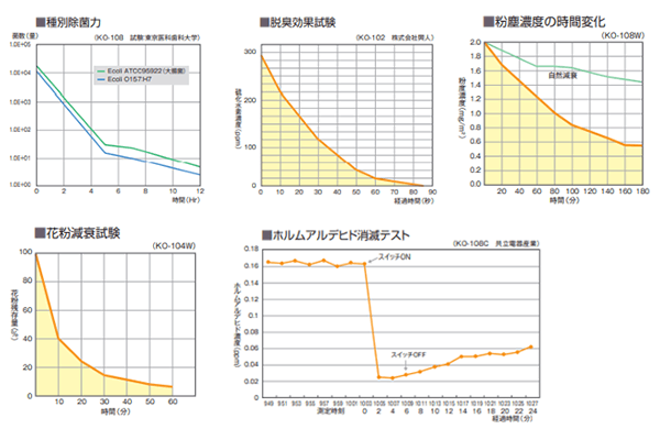 - 大学病院、交通機関をはじめとした様々な実使用空間にて、ウイルス、花粉、悪臭、PM2.5などに対する実証有効データを多数取得済み